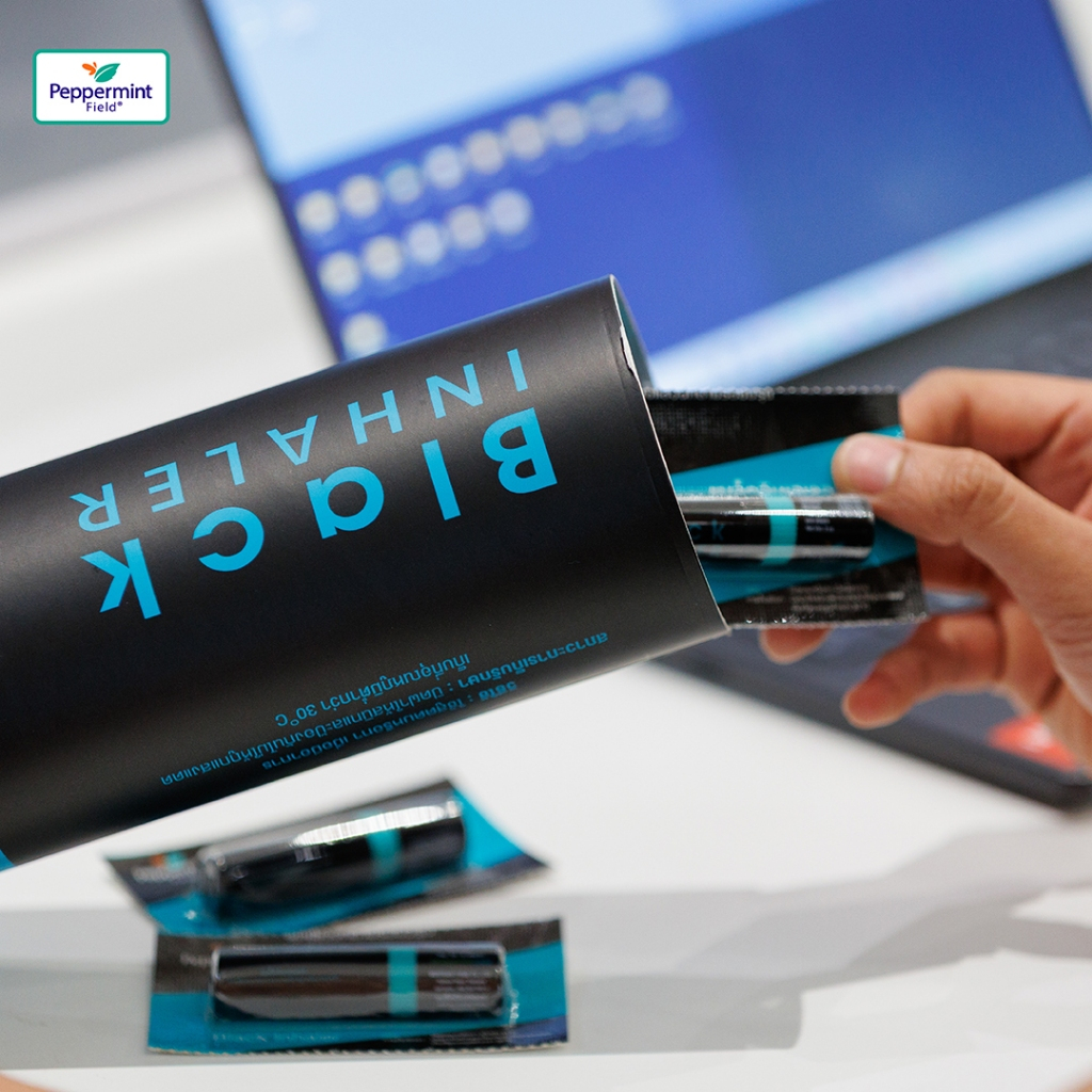 Peppermint Field Black Inhaler A cool looking, black colored Inhaler with Strong, cool aroma that clears up your nose from 2 times the amount of Eucalyptus Oil which also helps kill bacteria in your respiratory system. Inhale as often as needed since it contains only 2% camphor which is completely safe and not going to damage your nasal membrane.